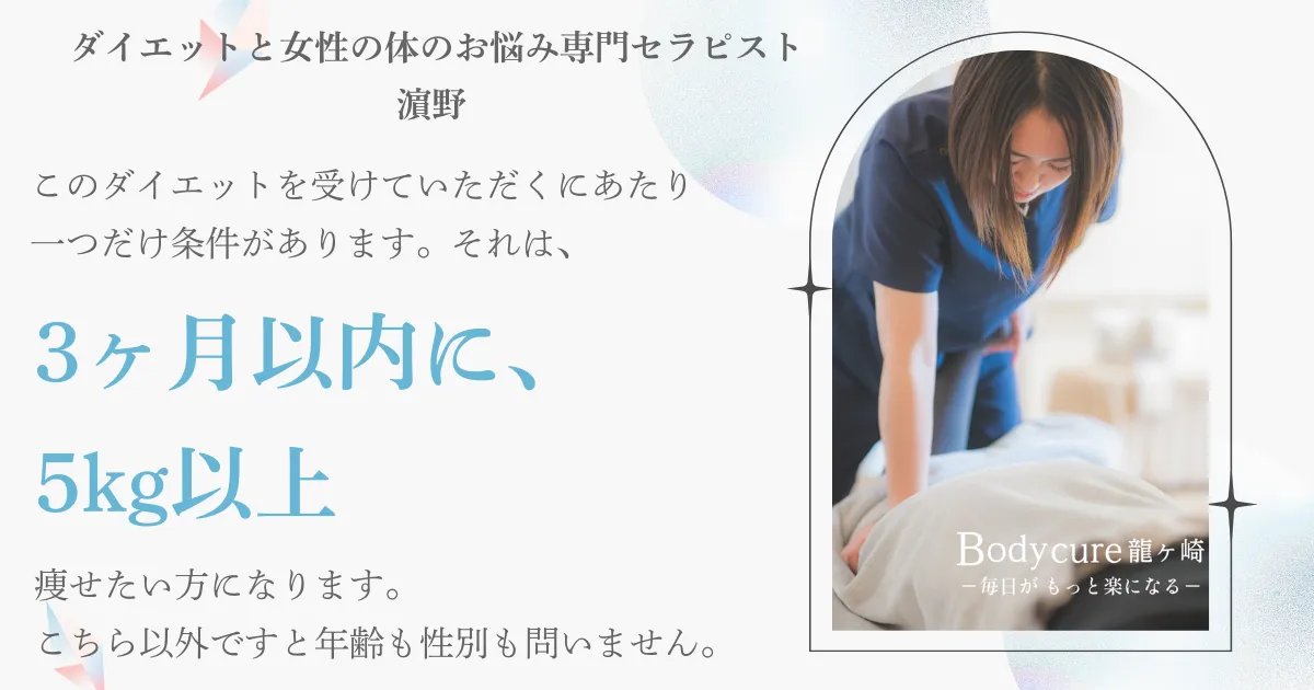Body cure 龍ヶ崎整体院は、"ただ体重を落とす"だけではなく、"痩せやすい体に生まれ変わる"場所です。あなたも、無理なく続く本物のダイエットを体験してみませんか?