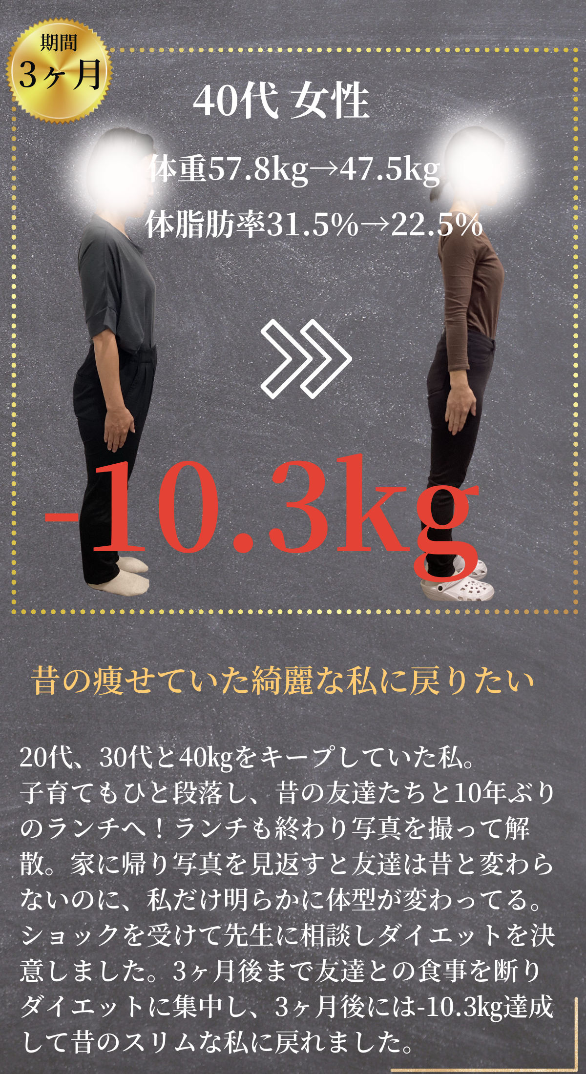 そんな声をいただきながら、数百名の方が"人生最後のダイエット"を成功されています。