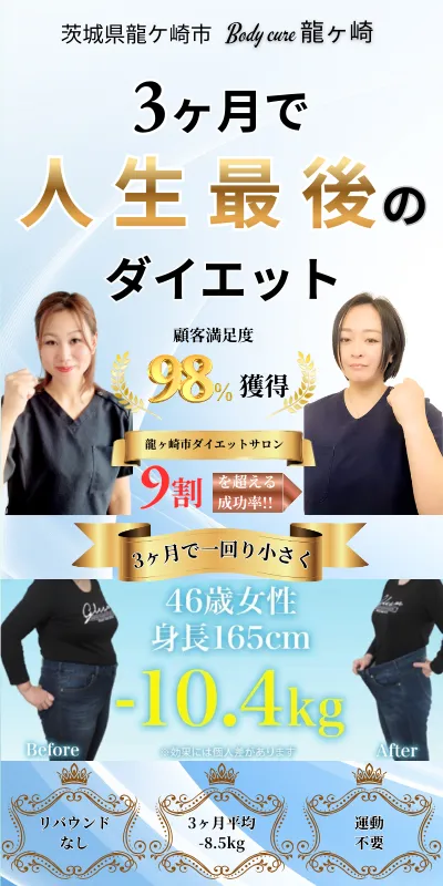 Body cure 龍ヶ崎整体院は、"ただ体重を落とす"だけではなく、"痩せやすい体に生まれ変わる"場所です。あなたも、無理なく続く本物のダイエットを体験してみませんか?